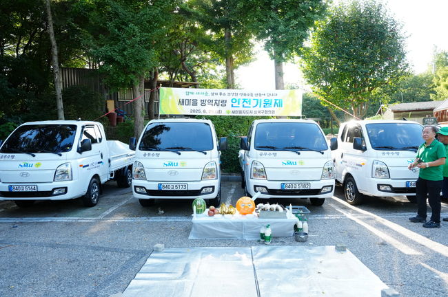 새마을 방역차량 안전기원제.성북구(구청장 이승로)는 최근 잦은 강수로 위생해충 활동이 활발해질 것으로 예상됨에 따라 새마을자율방역단에 방역차량 4대, 차량용 방역기 4대, 휴대용 연무기 6대를 지원했다고 27일 밝혔다. 이번 지원으로 하절기 집중 방역활동이 한층 원활하게 추진될 전망이다.