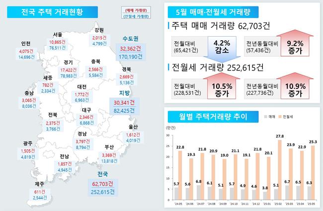 주택 거래는 매매가 62,703건으로 전월보다 4.2% 감소했다. 서울 아파트 매매는 7,221건으로 10.1% 줄어 금리 불확실성과 가격 부담 등이 영향을 미친 것으로 보인다. 반면 전월세 거래는 252,615건으로 10.5% 증가하며 계절적 수요가 반영됐다. 수도권은 전월세 거래가 9.8%, 비수도권은 12.2% 각각 늘었다.
