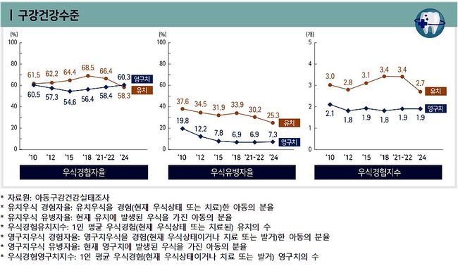 조사 결과, 12세 아동의 영구치 충치 경험률은 60.3%, 현재 충치 유병률은 7.3%로 나타났다. 2021~2022년 대비 충치 경험률은 1.9%포인트 증가했으며, 1인당 평균 충치 경험 치아 수는 1.9개로 정부의 목표치(1.5개)를 넘는 수준이다. 반면 5세 아동의 유치 충치 경험률은 58.3%로, 2018년 이후 감소 추세를 보이고 있다.