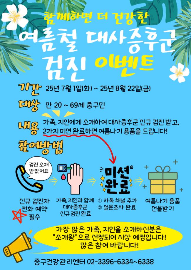 여름철 대사증후군 검진 이벤트 포스터.최근 한국인의 대사증후군 유병률이 꾸준히 증가하고 있음에도 불구하고, 일상과 생계로 건강관리에 시간을 내기 어려운 주민들이 많은 상황에서 마련된 이번 이벤트는 20세에서 69세 사이의 중구민 또는 중구 생활권자를 대상으로 한다. 대상자는 가족이나 지인과 함께 검진에 참여할 수 있으며, 함께 검진을 받을 경우 구두 동의를 받은 뒤 사전 예약을 통해 신청하면 된다.