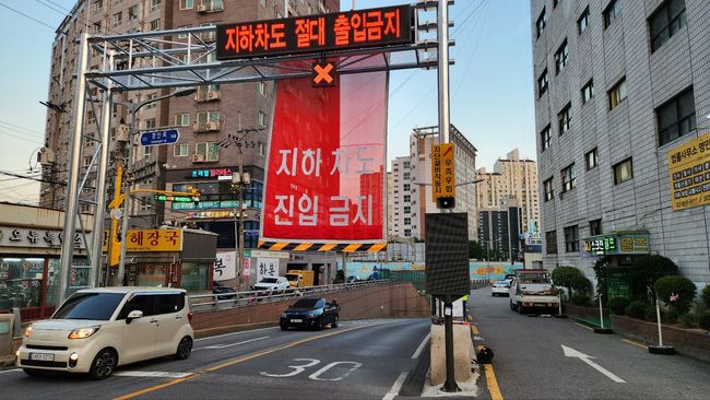 오류 지하차도 차량 진입 차단설비 가동 모습