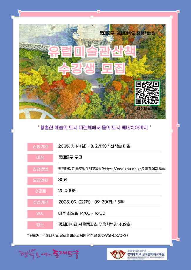 경희대학교 글로벌미래교육원과 협력한 ‘유럽 미술관 산책’ 프로그램은 9월 2일부터 30일까지 매주 화요일 총 5회에 걸쳐 진행된다. 이탈리아 주요 미술관 소장 작품을 중심으로 유럽 미술사의 흐름과 예술적 배경을 해설하며, 미술사 전문가가 실시간 작품 이야기와 시대적 맥락을 소개한다. 모집 인원은 30명이며, 경희대 글로벌미래교육원 누리집에서 접수할 수 있다.