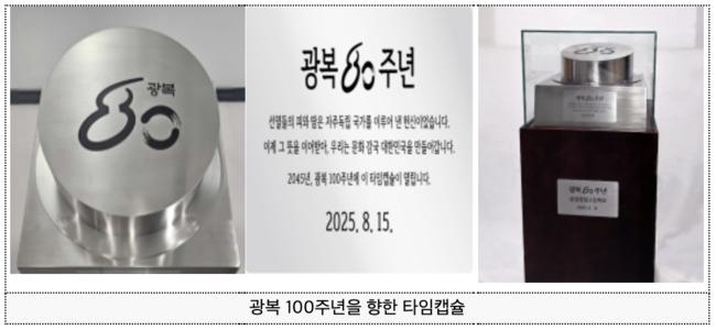 타임캡슐은 ‘광복 80년’ 엠블럼과 ‘선열들의 희생과 헌신을 계승해 문화강국 대한민국을 만들어 가겠다’는 다짐을 새긴 명판을 부착하고, 전시형 구조로 제작해 학교 교육 현장에서 활용할 수 있도록 했다.
