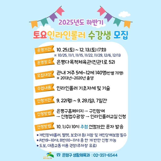 `토요일엔 인라인 배우자!`... 은평구, 어린이 인라인롤러 교실 참여자 모집.은평구(구청장 김미경)는 이번 모집을 9월 22일부터 28일까지 진행하며, 은평구청 누리집 ‘구민참여-신청접수광장’을 통해 보호자의 본인인증 후 어린이 이름으로 신청할 수 있다.