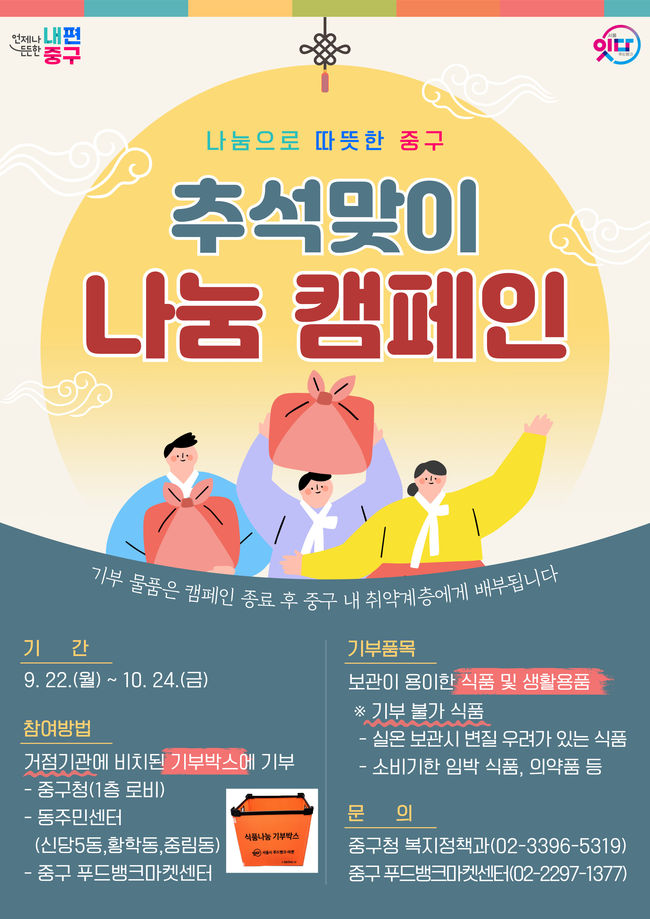 서울 중구가 추석을 앞두고 취약계층과 복지시설을 지원하기 위해 주민 참여형 ‘2025 추석맞이 나눔 캠페인’을 진행한다.