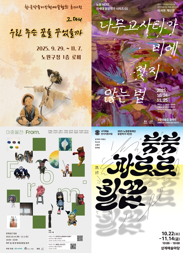 노원구 전시4종 홍보 포스터.서울 노원구(구청장 오승록)는 24일 구민들이 일상 속에서 풍성한 문화예술을 즐길 수 있도록 지역 곳곳의 갤러리 전시 콘텐츠를 새단장했다고 밝혔다.