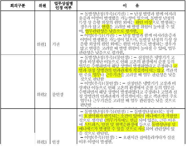 질병판정위원회의 업무상질병 인정 여부에 대한 위원별 판단 및 그 이유 (출처 : 노동인권실현을 위한 노무사모임 입법연구분과)