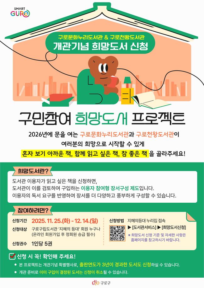 구로구가 주민이 원하는 책을 직접 신청해 도서관 장서로 구성하는 ‘희망도서 프로젝트’를 추진한다.