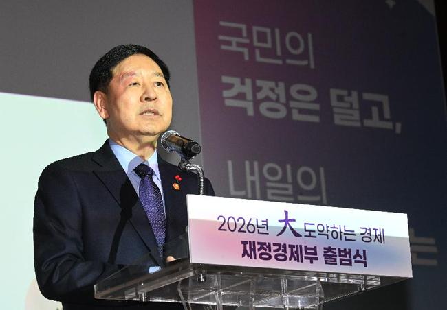 구윤철 부총리 겸 재정경제부 장관이 2026년 1월 2일 정부세종청사에서 열린 재정경제부 출범식 참석, 출범사를 하고 있다.